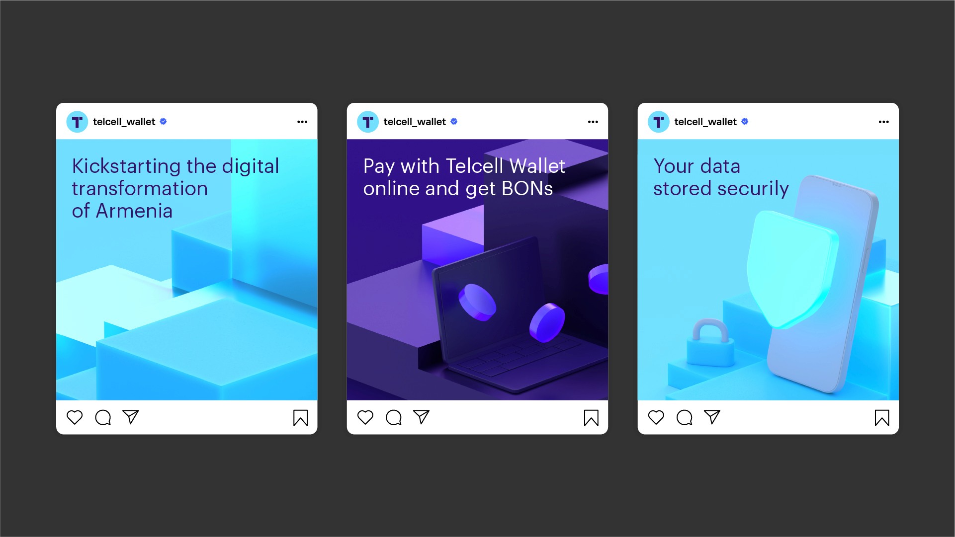 Telcell Wallet, an Armenian e-wallet, was tasked with reflecting strategic constants in its identity. It was important to reflect the archetype of the sage and magician. The logo consists of a number 1, representing leadership, and a square, symbolizing a pixel. The visual language conveys digital transformation and the transition from analog to electronic formats. The identity is flexibly adaptable to different proportions and media, yet always remains recognizable. Telcell Wallet also developed signature 3D objects that effectively serve communication and image purposes. Made at LINII Role: Creative Director